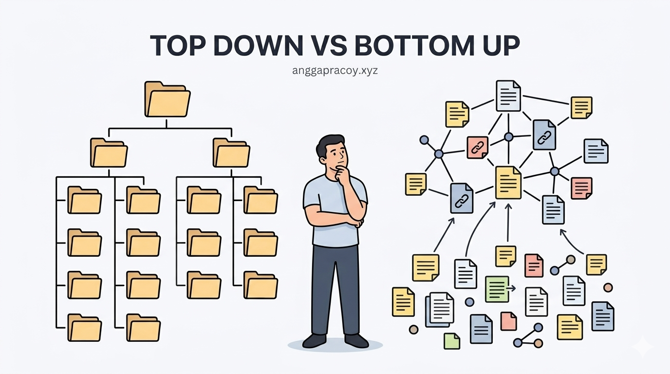 Bottom up cocok kalau anda suka eksplorasi, sering nulis hal-hal yang belum jelas kategorinya, dan pengen sistem yang berkembang ngikutin cara berpikir anda — bukan sebaliknya.